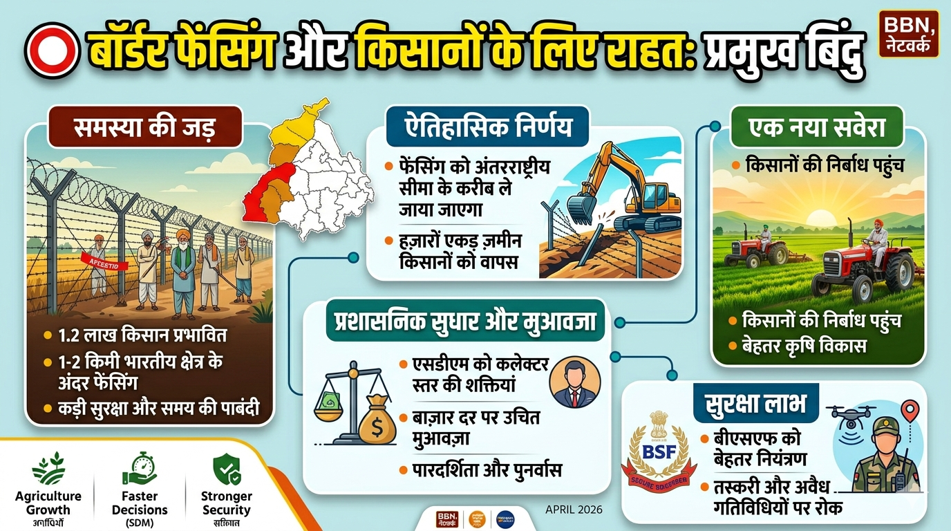 सरकार की योजना के तहत फेंसिंग को अंतरराष्ट्रीय सीमा के अधिक करीब, लगभग 150 से 200 मीटर तक स्थानांतरित किया जाएगा। इससे हजारों एकड़ कृषि भूमि पुनः किसानों की पहुंच में आ जाएगी और उनकी दैनिक कठिनाइयों में कमी आएगी।