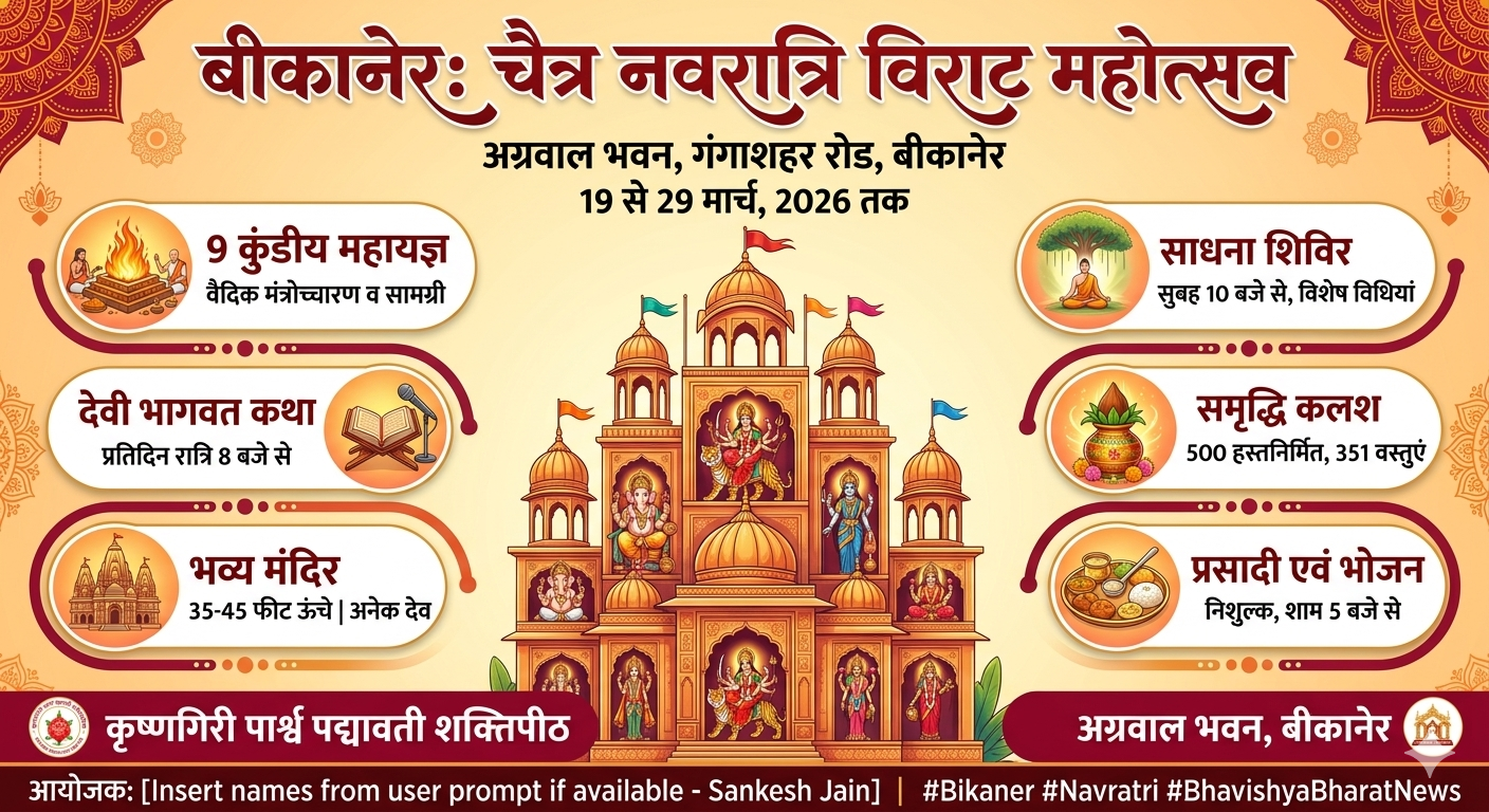 बीबीएन,बीकानेर: राजस्थान का बीकानेर इस वर्ष चैत्र नवरात्रि के अवसर पर एक भव्य और बहुआयामी धार्मिक आयोजन का साक्षी बनने जा रहा है। 19 मार्च से 29 मार्च तक गंगाशहर रोड स्थित अग्रवाल भवन परिसर में 11 दिवसीय विराट कथा यज्ञ महोत्सव आयोजित होगा, जिसमें देवी भागवत कथा, 9 कुंडीय महायज्ञ, दिव्य साधना शिविर, भजन संध्या और विशाल नि:शुल्क भोजन प्रसादी जैसे कार्यक्रम शामिल होंगे। आयोजन में देशभर से श्रद्धालुओं के पहुंचने की संभावना है। आयोजकों के अनुसार इस धार्मिक महोत्सव का आयोजन तमिलनाडु स्थित विश्व विख्यात कृष्णगिरी पार्श्व पद्मावती शक्तिपीठ से जुड़े आध्यात्मिक मार्गदर्शन में किया जा रहा है। कार्यक्रम में काशी से आए विद्वान पंडितों द्वारा वैदिक मंत्रोच्चारण के साथ विशेष यज्ञ अनुष्ठान भी संपन्न होंगे।