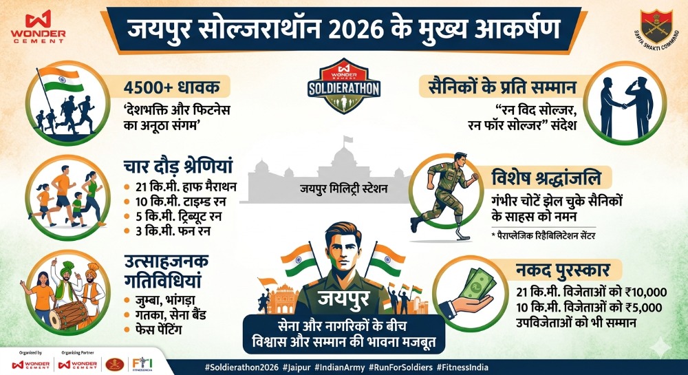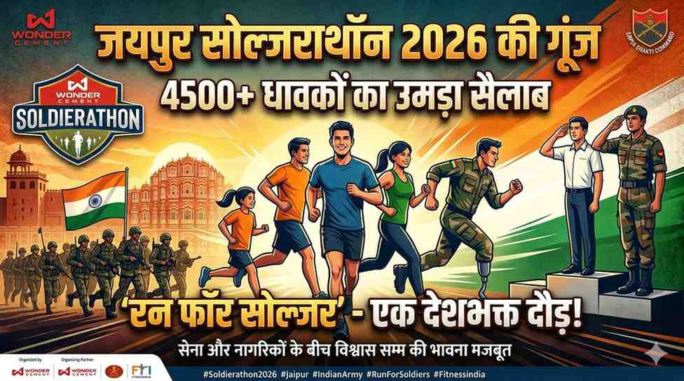 बीबीएन, नेटवर्क। राजधानी जयपुर में रविवार को देशभक्ति और फिटनेस का अनूठा संगम देखने को मिला, जब जयपुर मिलिट्री स्टेशन स्थित गांडीव स्टेडियम में वंडर सीमेंट जयपुर सोल्जराथॉन 2026 का सफल आयोजन किया गया। इस मैराथन में 4500 से अधिक धावकों ने भाग लेकर सैनिकों के प्रति सम्मान और राष्ट्र के प्रति अपनी प्रतिबद्धता का संदेश दिया। प्रतिभागियों में सेवारत सैनिक, पूर्व सैनिक, पेशेवर धावक, विद्यार्थी और बड़ी संख्या में आम नागरिक शामिल रहे।