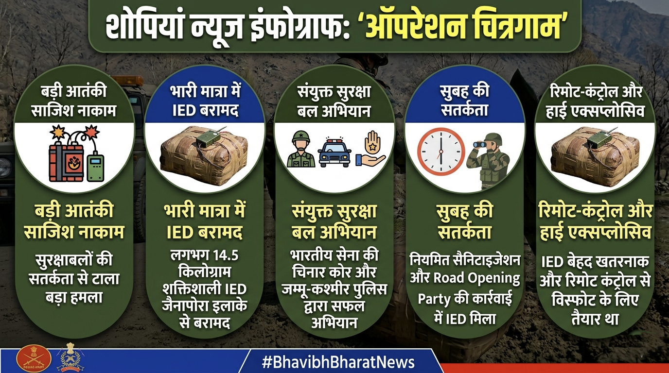 बीबीएन, नेटवर्क। जम्मू-कश्मीर के शोपियां जिले में सुरक्षाबलों ने एक बड़ी आतंकी साजिश को विफल कर दिया है। भारतीय सेना की चिनार कोर और जम्मू-कश्मीर पुलिस ने एक संयुक्त अभियान के दौरान जैनापोरा इलाके से लगभग 14.5 किलोग्राम वजन का शक्तिशाली इम्प्रोवाइज्ड एक्सप्लोसिव डिवाइस (IED) बरामद किया। ‘ऑपरेशन चित्रगाम’ के तहत की गई इस कार्रवाई में विस्फोटक को समय रहते खोज कर सुरक्षित रूप से निष्क्रिय कर दिया गया, जिससे एक बड़ा संभावित जान-माल का नुकसान टल गया।