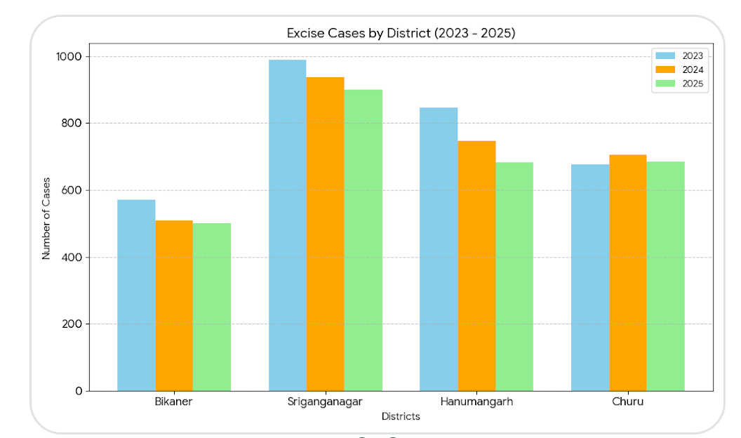 बीकानेर जिले में आबकारी मामलों की संख्या में लगातार कमी देखी गई है। प्रशासनिक स्तर पर इसे सीमावर्ती इलाकों में सतर्कता और स्थानीय नेटवर्क के कमजोर होने से जोड़ा जा रहा है। इसके उलट, चूरू जिले में मामलों की संख्या हर साल बढ़ती गई, जिसने रेंज के कुल आंकड़ों को ऊपर खींचा। श्रीगंगानगर और हनुमानगढ़ में दर्ज मामलों की संख्या में बड़े उतार-चढ़ाव नहीं दिखे, लेकिन तस्करी के रूट्स सक्रिय बने रहे।