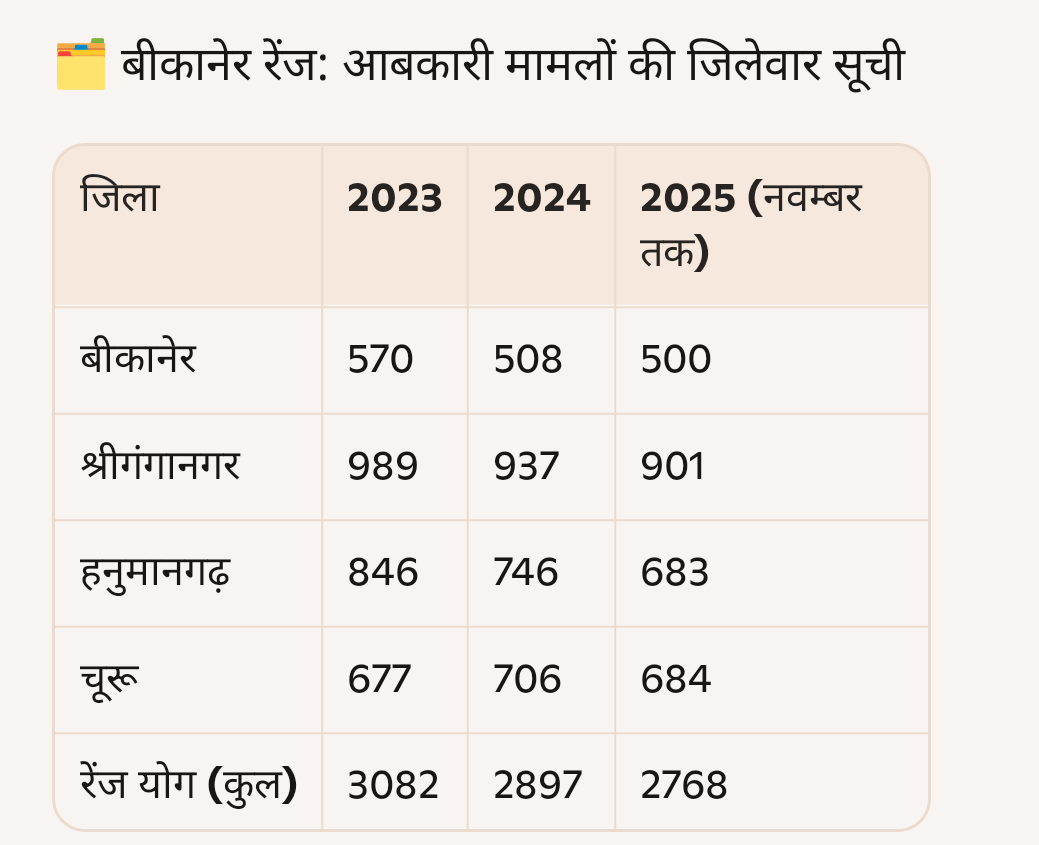 बीबीएन, बीकानेर | बीकानेर रेंज में आबकारी अधिनियम से जुड़े मामलों का स्वरूप बीते तीन वर्षों में तेजी से बदला है। 2023 से 2025 (नवंबर तक) के आंकड़े बताते हैं कि जहां बीकानेर जिले में मामलों में लगातार गिरावट आई, वहीं चूरू में हर साल उल्लेखनीय बढ़ोतरी दर्ज हुई।