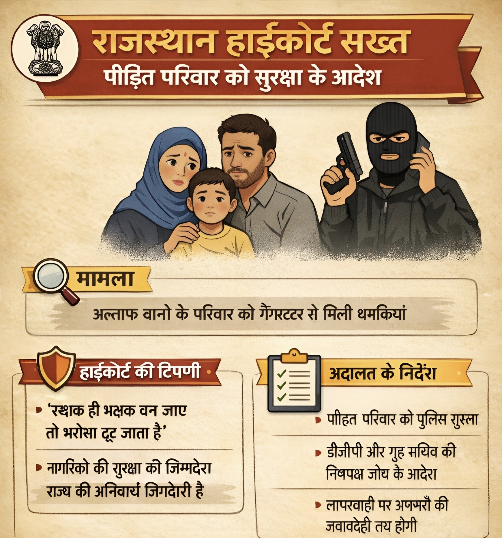 मामला उस याचिका से संबंधित है जिसे अल्ताफ बानो और उनके परिजनों की ओर से प्रस्तुत किया गया था। याचिका में आरोप लगाया गया कि पूर्व में दर्ज प्रकरण से जुड़े विवाद के कारण परिवार को आपराधिक तत्वों के माध्यम से धमकियां दी गईं, जिससे उनके जीवन और स्वतंत्रता पर खतरा उत्पन्न हुआ। अदालत ने प्राथमिक दृष्टि से आरोपों की गंभीरता स्वीकार करते हुए कहा कि यदि राज्य तंत्र नागरिकों की रक्षा करने में विफल रहता है तो यह संविधान प्रदत्त मूल अधिकारों के प्रतिकूल स्थिति होगी।