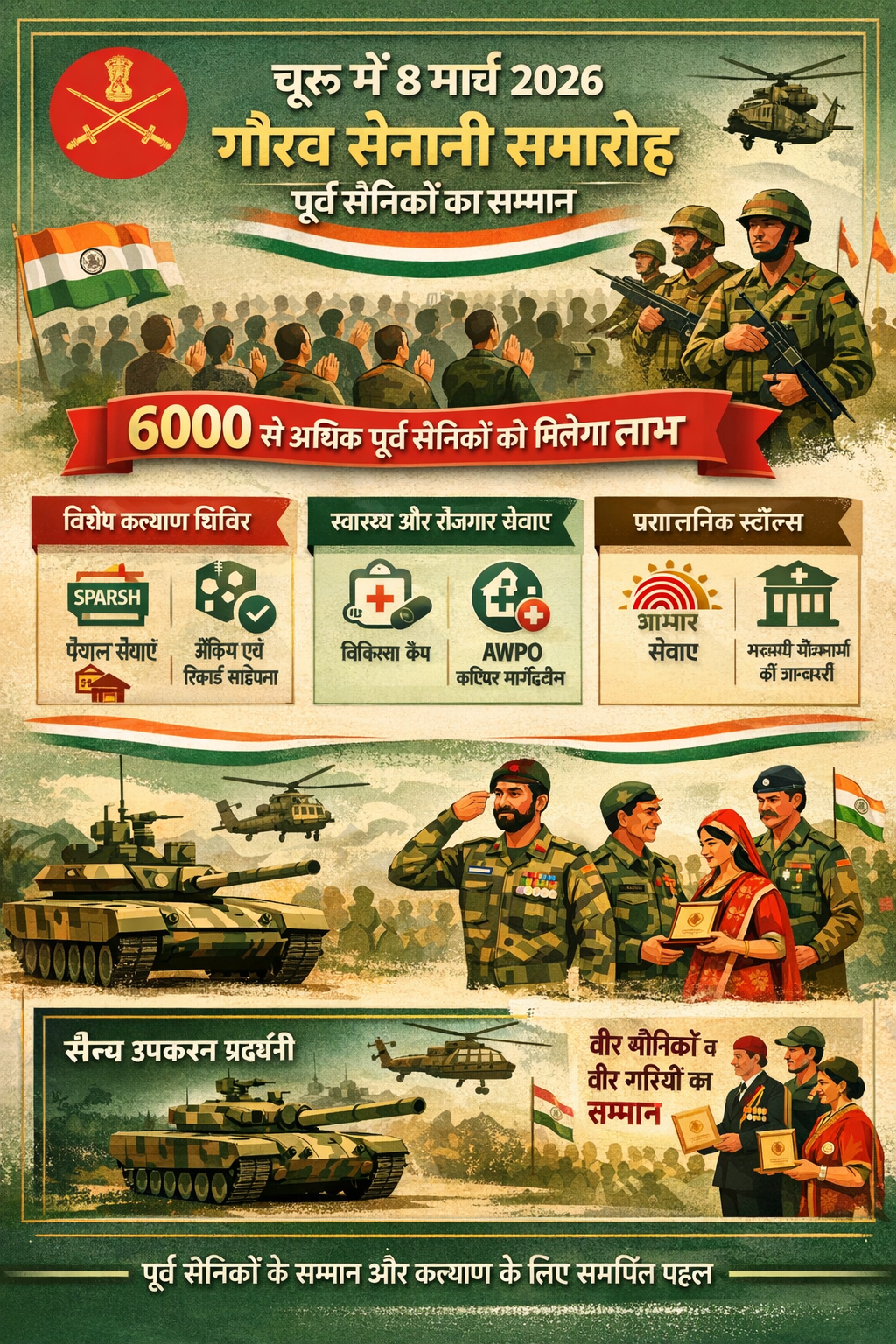 बीबीएन, बीकानेर। भारतीय सेना के सप्त शक्ति कमान के तत्वावधान में रणबांकुरा डिविजन 8 मार्च 2026 को चूरू के एसएआई स्पोर्ट्स स्टेडियम में “गौरव सेनानी समारोह” का आयोजन करने जा रहा है। इस आयोजन का उद्देश्य जिले की सभी आठ तहसीलों के पूर्व सैनिकों, वीर नारियों और वीरांगनाओं को सम्मानित करना तथा उनकी समस्याओं के समाधान के लिए एक समन्वित मंच उपलब्ध कराना है। समारोह से लगभग छह हजार से अधिक पूर्व सैनिकों और उनके परिवारों को प्रत्यक्ष लाभ मिलने की संभावना जताई जा रही है।