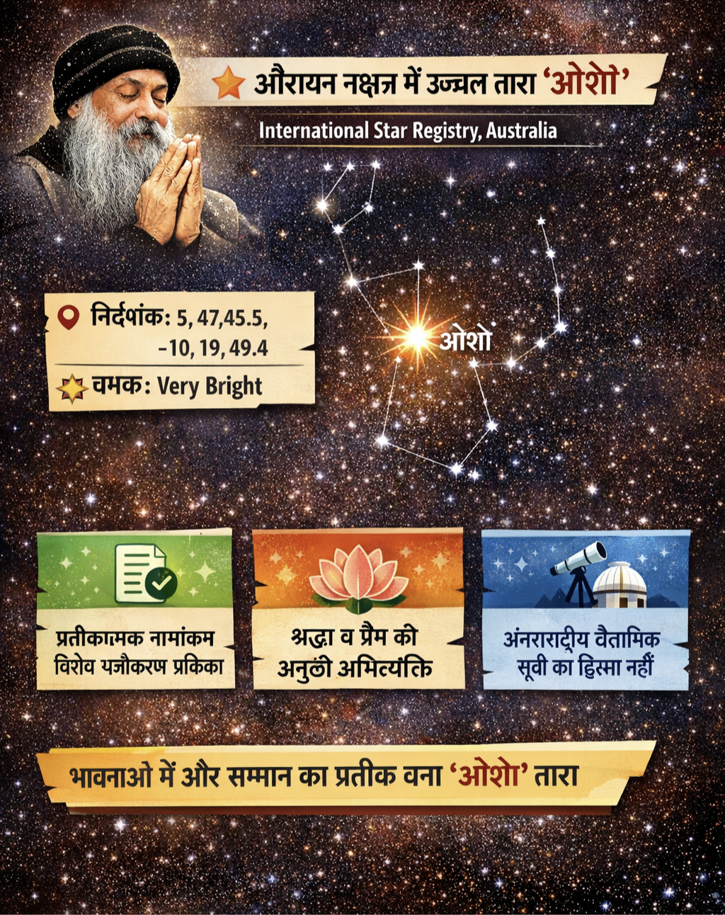बीबीएन, नेटवर्क। आध्यात्मिक चिंतक ओशो के अनुयायियों ने ऑस्ट्रेलिया स्थित एक संगठन के माध्यम से आकाशीय पिंड के नामकरण की पहल करते हुए ओरायन तारामंडल के एक उज्ज्वल तारे को “ओशो” नाम समर्पित किया है। यह नामांकन इंटरनेशनल स्टार एंड स्पेस रजिस्ट्री, ऑस्ट्रेलिया द्वारा पंजीकृत बताया गया है। संबंधित समूहों के अनुसार यह पहल श्रद्धा और कृतज्ञता की अभिव्यक्ति के रूप में की गई है। तारे के निर्देशांक 5, 47, 45.5 तथा -10, 19, 49.4 बताए गए हैं और उसकी चमक श्रेणी ‘अत्यंत उज्ज्वल’ दर्ज की गई है।