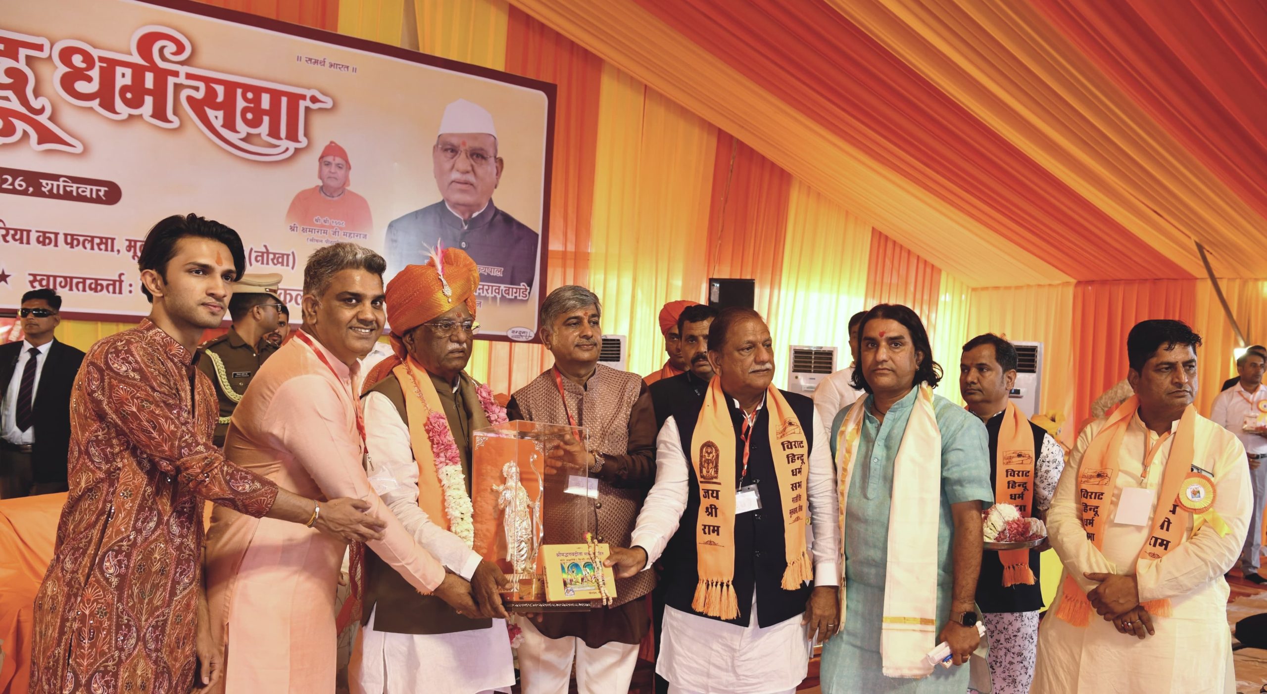 कार्यक्रम में साध्वी ऋतंभरा, सीथल पीठाधीश्वर क्षमाराम महाराज, श्रीबालाजी धाम के बजरंग दास, हनुमानगढ़ी (अयोध्या) के राजू दास महाराज, कुशाल गिरि महाराज, प्रताप पुरी महाराज, सरजूदास महाराज, स्वामी विमर्शानंद तथा राष्ट्रीय स्वयंसेवक संघ के क्षेत्र प्रचारक निंबाराम सहित संत समाज के प्रतिनिधि उपस्थित रहे । स्वागत उद्बोधन नरसी कुलरिया ने दिया। आयोजन में विश्वकर्मा कौशल विकास बोर्ड के अध्यक्ष रामगोपाल सुथार, भंवर कुलरिया, पूनम कुलरिया सहित स्थानीय जनप्रतिनिधि और बड़ी संख्या में श्रद्धालु मौजूद रहे।