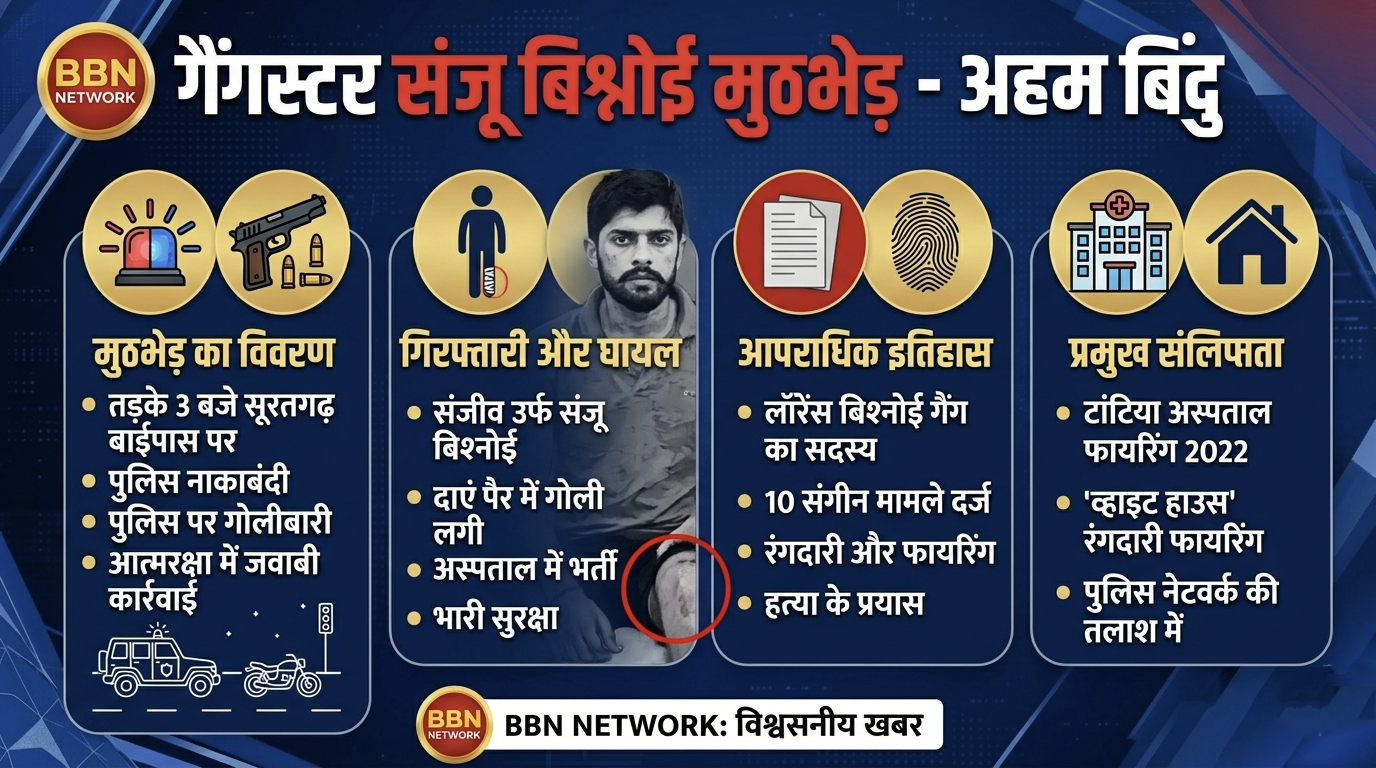 श्रीगंगानगर पुलिस को गुप्त सूचना मिली थी कि लॉरेंस गैंग से जुड़ा एक संदिग्ध अपराधी बाइक पर बाईपास क्षेत्र से शहर की ओर आने वाला है। सूचना के आधार पर थानाधिकारी सुभाष ढील के नेतृत्व में पुलिस टीम ने सूरतगढ़ बाईपास पुल पर नाकाबंदी की। तड़के करीब 3 बजे जब पुलिस ने बाइक सवार को रुकने का इशारा किया, तो आरोपी ने भागने का प्रयास किया। जब पुलिस ने उसे घेरा, तो उसने सीधे पुलिस टीम पर गोलियां चलानी शुरू कर दीं।