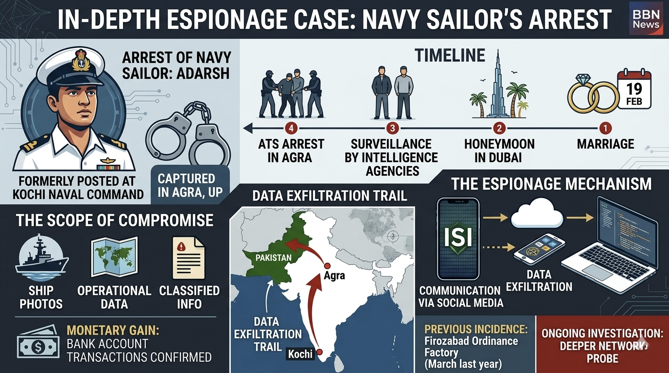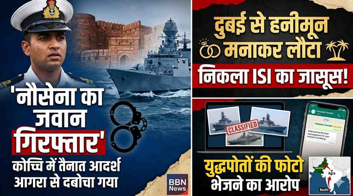 बीबीएन, नेटवर्क। पाकिस्तान की खुफिया एजेंसी आईएसआई के लिए जासूसी करने के सनसनीखेज आरोप में भारतीय नौसेना के एक जवान को उत्तर प्रदेश एटीएस ने आगरा से गिरफ्तार किया है। गिरफ्तार आरोपी की पहचान आदर्श कुमार उर्फ लकी के रूप में हुई है, जो केरल के कोच्चि स्थित दक्षिणी नौसेना कमान में तैनात था। एटीएस का दावा है कि आरोपी लंबे समय से आईएसआई के संपर्क में था और सामरिक महत्व की सूचनाएं तथा युद्धपोतों की तस्वीरें पाकिस्तानी हैंडलर को भेज रहा था। अदालत में पेशी के बाद उसे 14 दिन की न्यायिक हिरासत में जेल भेज दिया गया है।