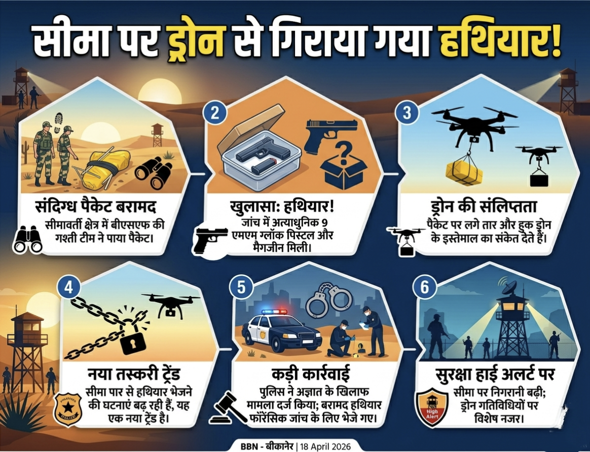 बीएसएफ की गश्ती टीम को रायसिंहनगर नगर की सीमा के निकट एक पीले रंग का संदिग्ध पैकेट दिखाई दिया। पैकेट पर तार और हुक बंधा हुआ था, जिससे संदेह और गहरा गया। तुरंत स्थानीय पुलिस को सूचना दी गई, जिसके बाद संयुक्त टीम मौके पर पहुंची। जांच के दौरान जब पैकेट को खोला गया, तो उसमें एक अत्याधुनिक 9 एमएम ग्लॉक पिस्टल और एक मैगजीन बरामद हुई। सुरक्षा विशेषज्ञों के अनुसार, पैकेट पर लगे तार और हुक इस बात की ओर संकेत करते हैं कि इसे ड्रोन के माध्यम से गिराया गया होगा।