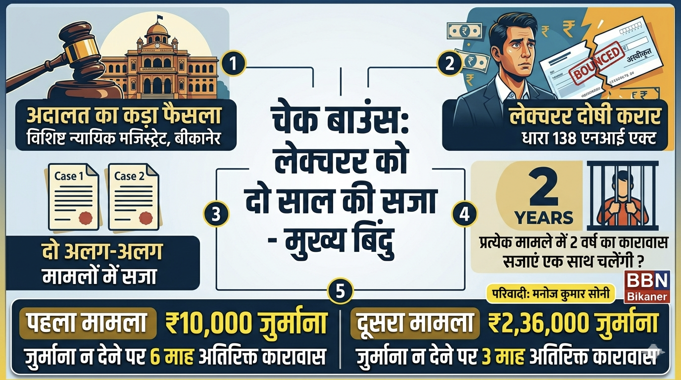 बीबीएन,बीकानेर। चेक अनादरण के दो अलग-अलग मामलों में बीकानेर स्थित इंजीनियरिंग कॉलेज के लेक्चरर हमीद अली को अदालत ने दोषी ठहराते हुए प्रत्येक मामले में दो-दो वर्ष के साधारण कारावास की सजा सुनाई है। साथ ही अदालत ने दोनों मामलों में अलग-अलग लाखों रुपये का अर्थदंड भी लगाया है। अर्थदंड का भुगतान न करने पर अतिरिक्त कारावास भुगतना होगा। यह फैसला विशिष्ट न्यायिक मजिस्ट्रेट (एनआई एक्ट प्रकरण) संख्या-2, बीकानेर की अदालत ने सुनाया, जिसमें दोनों मामलों में आरोपी को परक्राम्य लिखत अधिनियम की धारा 138 के तहत दोषी पाया गया।