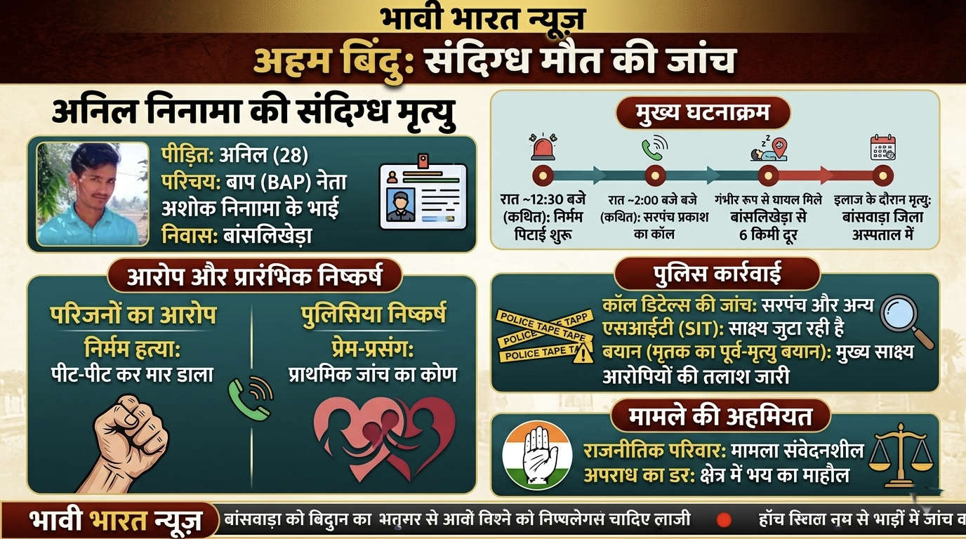पुलिस सूत्रों के अनुसार, घटना सोमवार देर रात खमेरा थाना क्षेत्र के कलिमगरा गांव के पास की है। मृतक अनिल अपने निवास बांसलिखेड़ा से करीब 6 किलोमीटर दूर झाड़ियों में गंभीर रूप से घायल अवस्था में पाए गए थे। अशोक निनामा का दावा है कि रात करीब 2 बजे उन्हें स्थानीय सरपंच प्रकाश का फोन आया, जिसने अनिल की लोकेशन बताते हुए उन्हें वहां से ले जाने को कहा।