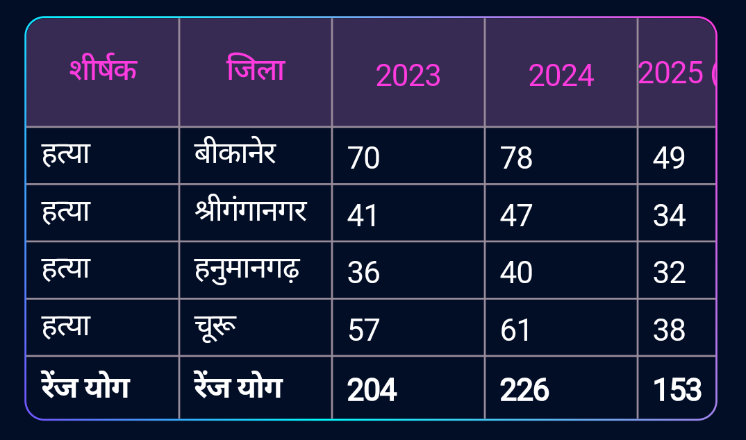 рдмреАрдХрд╛рдиреЗрд░ рд░реЗрдВрдЬ рдореЗрдВ рд╡рд░реНрд╖ 2023 рдореЗрдВ рдХреБрд▓ 204 рд╣рддреНрдпрд╛ рдХреЗ рдорд╛рдорд▓реЗ рджрд░реНрдЬ рд╣реБрдП рдереЗред 2024 рдореЗрдВ рдпрд╣ рдЖрдВрдХрдбрд╝рд╛ рдмрдврд╝рдХрд░ 226 рддрдХ рдкрд╣реБрдВрдЪрд╛, рдЬрд┐рд╕рд╕реЗ рдЪрд┐рдВрддрд╛ рдмрдврд╝реАред рд╣рд╛рд▓рд╛рдВрдХрд┐ 2025 рдореЗрдВ рдирд╡рдВрдмрд░ рддрдХ рдпрд╣ рд╕рдВрдЦреНрдпрд╛ рдШрдЯрдХрд░ 153 рд░рд╣ рдЧрдИ, рдЬреЛ рд╕рд╛рдл рд╕рдВрдХреЗрдд рджреЗрддрд╛ рд╣реИ рдХрд┐ рдмреАрддреЗ рдПрдХ рд╕рд╛рд▓ рдореЗрдВ рдЕрдкрд░рд╛рдз рдирд┐рдпрдВрддреНрд░рдг рдХреЗ рдкреНрд░рдпрд╛рд╕ рддреЗрдЬ рд╣реБрдП рд╣реИрдВред