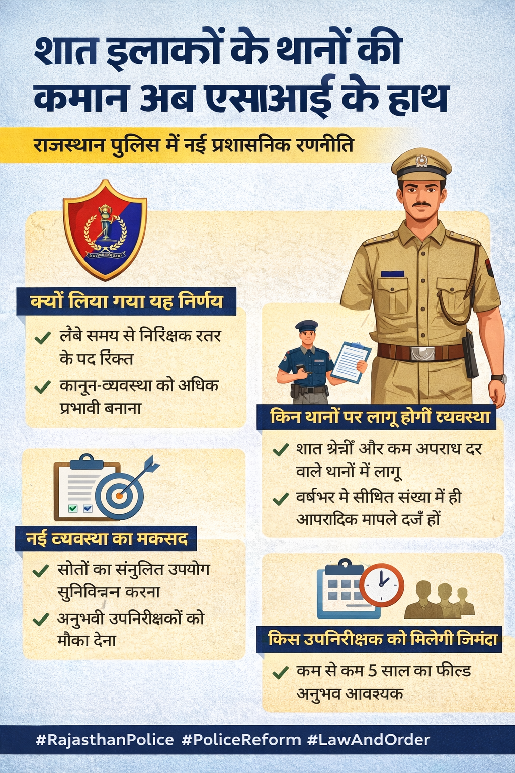 बीबीएन, नेटवर्क | राज्य की कानून-व्यवस्था को अधिक प्रभावी बनाने और निरीक्षक स्तर पर लंबे समय से बनी कमी को दूर करने के उद्देश्य से राजस्थान पुलिस ने प्रशासनिक ढांचे में महत्वपूर्ण बदलाव लागू करने का निर्णय लिया है। नए निर्देशों के अनुसार कम अपराध दर वाले और अपेक्षाकृत शांत क्षेत्रों के कुछ थानों की जिम्मेदारी अनुभवी उपनिरीक्षकों को सौंपी जाएगी, जबकि संवेदनशील तथा उच्च अपराध दर वाले थानों पर वरिष्ठ अधिकारियों की नियुक्ति यथावत रखी जाएगी। यह निर्णय महानिदेशक राजीव शर्मा के आदेशों के बाद प्रभावी माना जा रहा है।