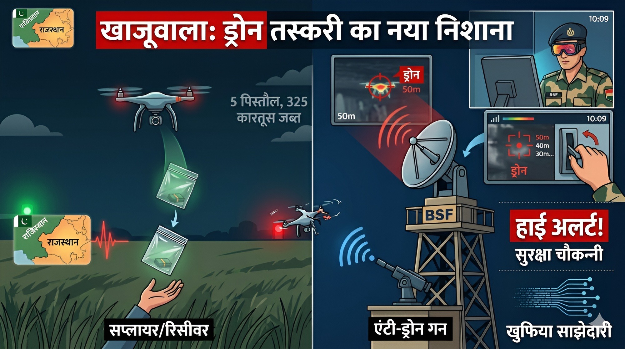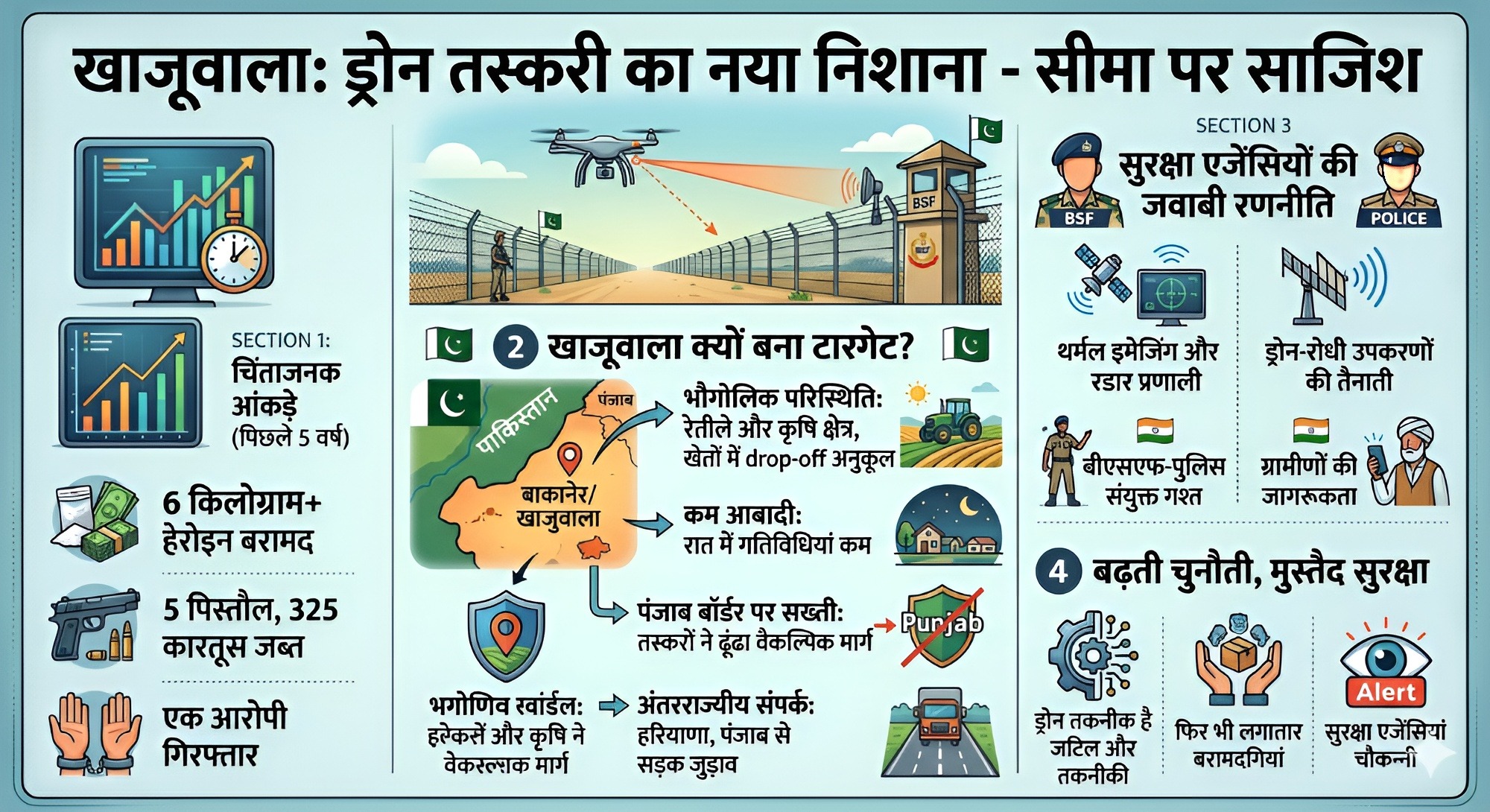 सुरक्षा विश्लेषकों की मानें तो खाजूवाला की भौगोलिक बनावट तस्करों के लिए सबसे बड़ा प्लस पॉइंट है। पंजाब में कड़े पहरे और आधुनिक रडार तकनीक के कारण वहां ड्रोन उड़ाना अब तस्करों के लिए सुसाइड मिशन जैसा हो गया है, इसलिए उन्होंने राजस्थान के कम आबादी वाले इलाकों की ओर रुख किया है।