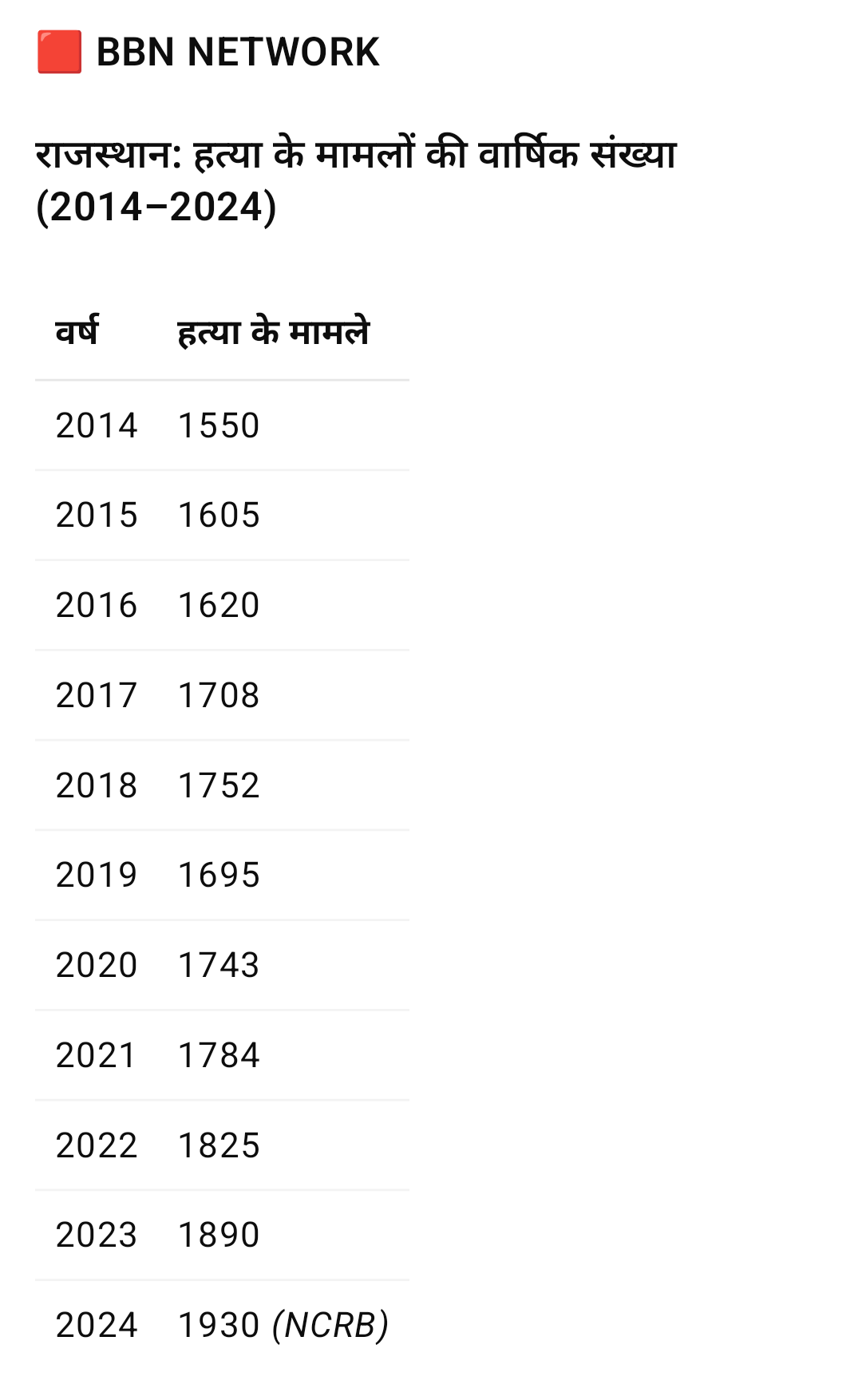 2023 में विधानसभा में जो आंकड़े पेश किए गए, उनके मुताबिक कुल 1,869 हत्याएं हुईं यानी हर घंटे कोई न कोई जान गई। लेकिन सियासतदानों की नींद नहीं टूटी। “सब कंट्रोल है ” का ढकोसला करते रहे। राज्य के कई जिलों में हालात इतने बिगड़ चुके हैं कि लोग घर से निकलते वक्त यह सोचने लगे हैं कि लौटेंगे भी या नहीं। धरती का स्वाभिमान कहे जाने वाला राजस्थान, आज गुंडों, तस्करों और बदमाशों का अड्डा बनता जा रहा है।