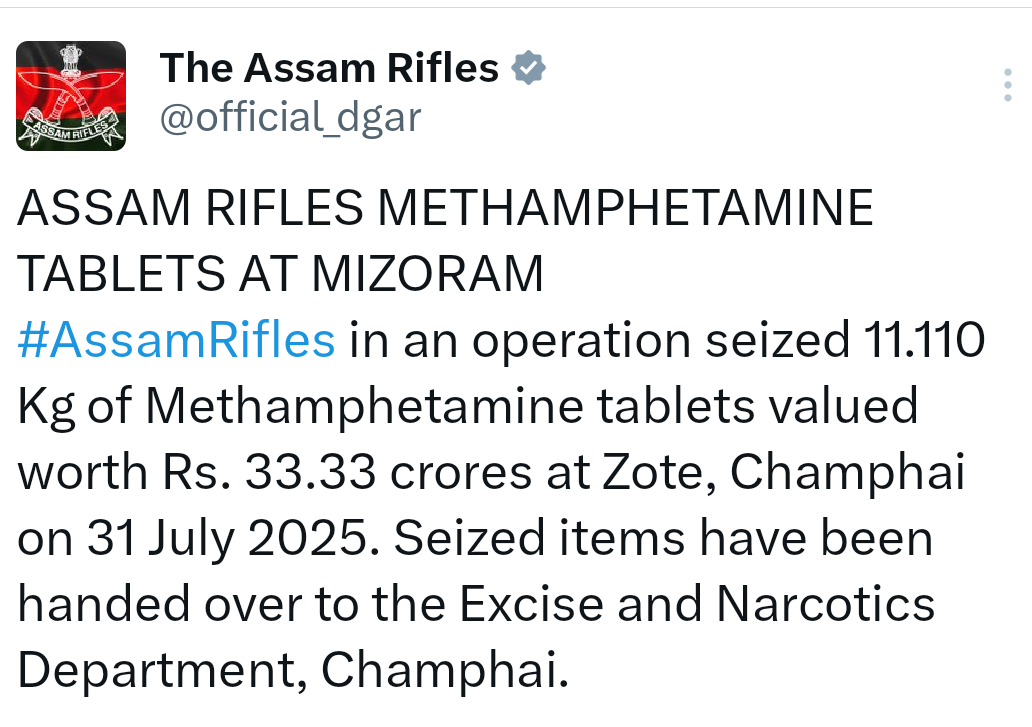 असम राइफल्स ने इस ऑपरेशन को राज्य में मादक पदार्थों की रोकथाम की दिशा में एक अहम सफलता बताया है। अधिकारियों का कहना है कि सीमावर्ती इलाकों में मादक पदार्थों की तस्करी पर पूरी सख्ती के साथ नजर रखी जा रही है।